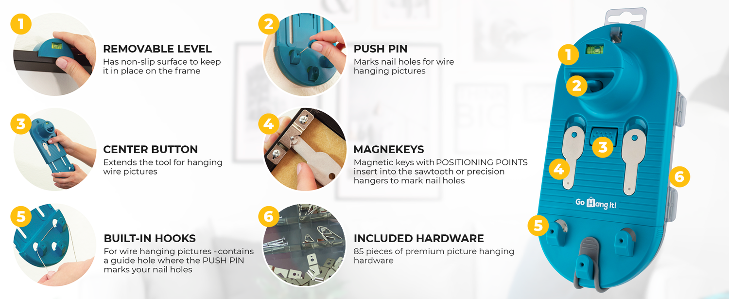 The Go Hang It! Pro includes a Removable Level, Push Pin, Center Extension Button, 2 MagneKeys, Built-in Wire Hanging Hooks (see product key below), and a Hard Carry Case with 85 Pieces of picture hanging hardware.
