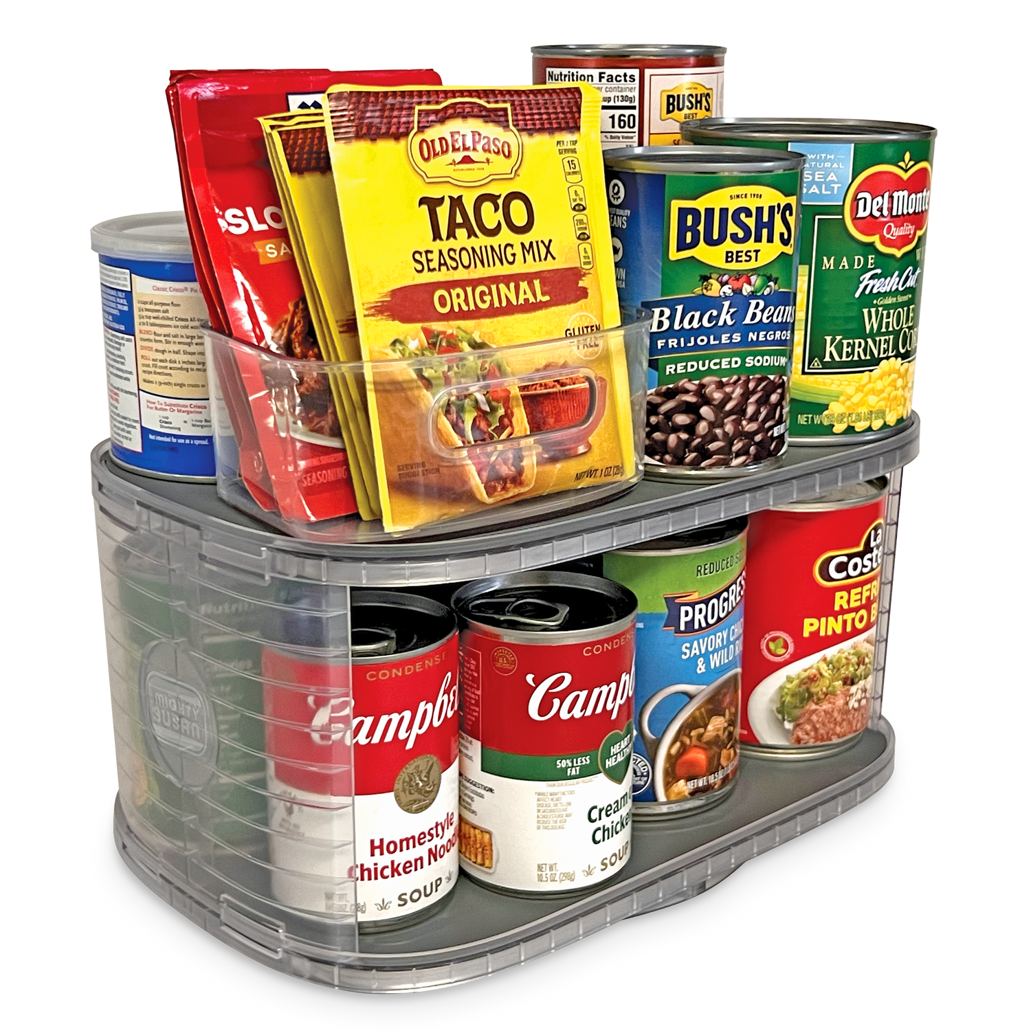 The Mighty Susan is designed to be incredibly strong! She's steel-reinforced, holds up to 30 pounds, and can store up to 20 regular-sized soup cans. But while she's strong enough to hold cans, she's also versatile enough to organize much more: snacks, teas, spices, crafts, office supplies, etc. The possibilities are endless!