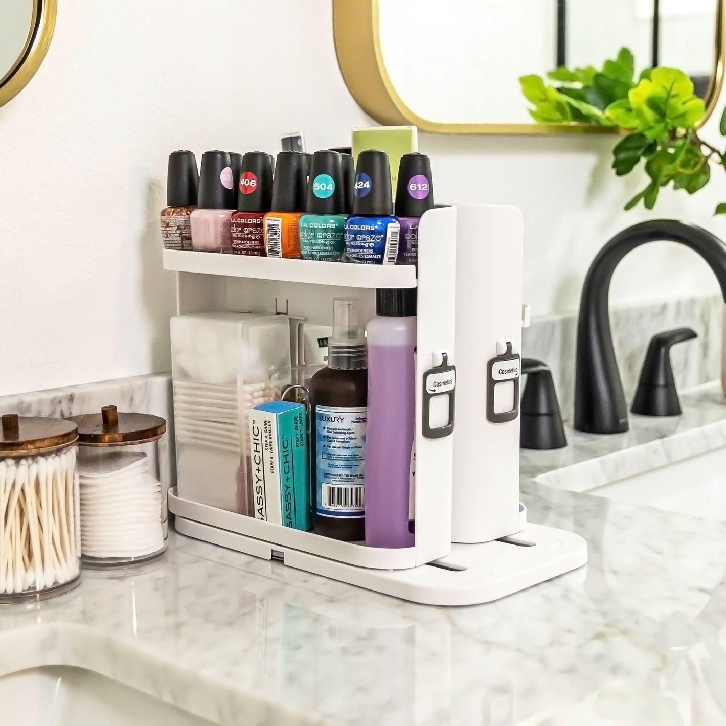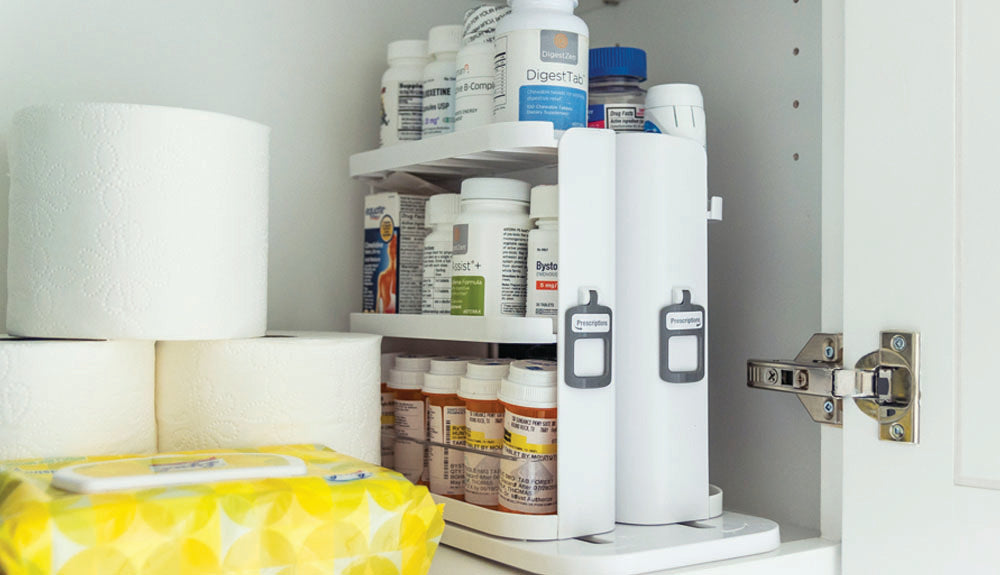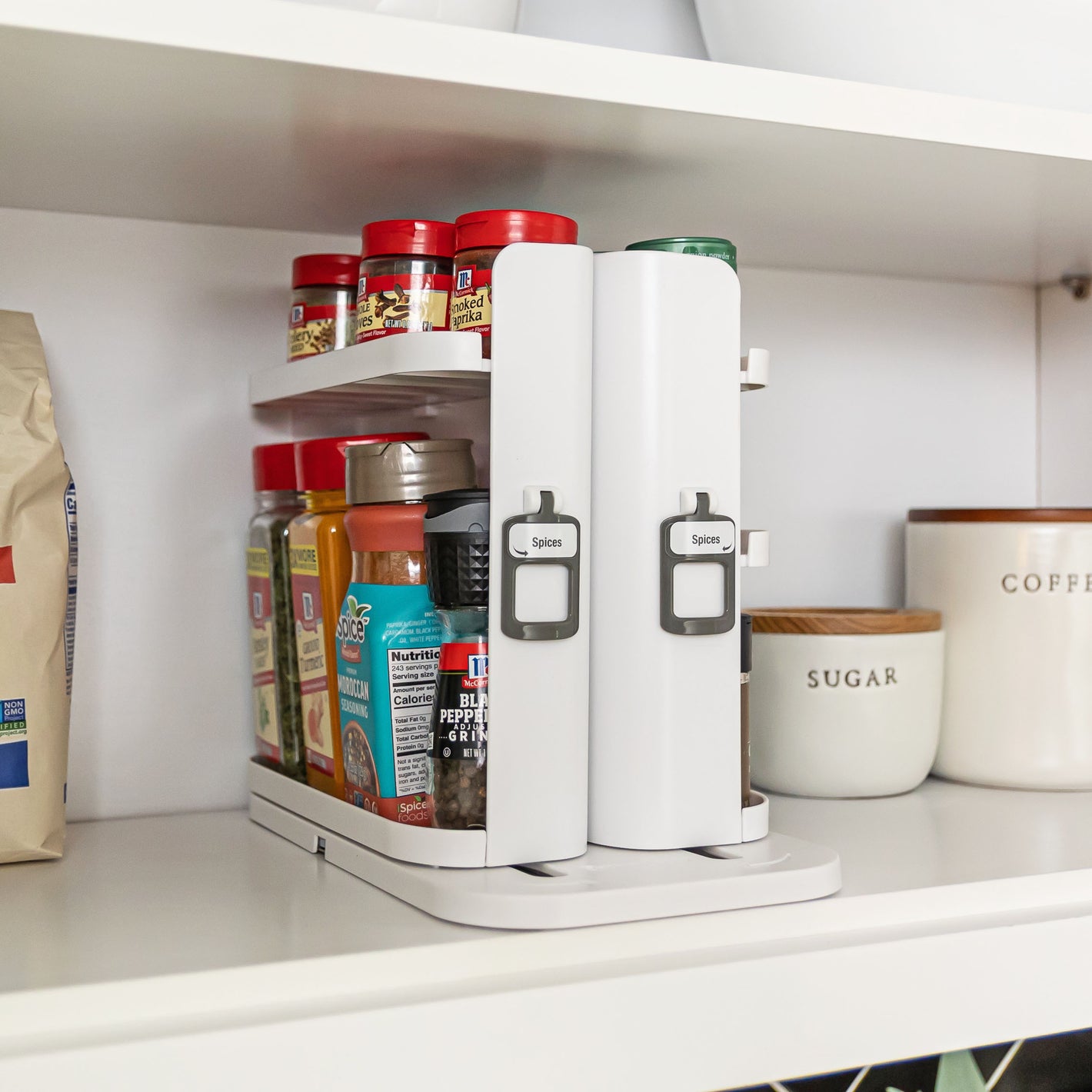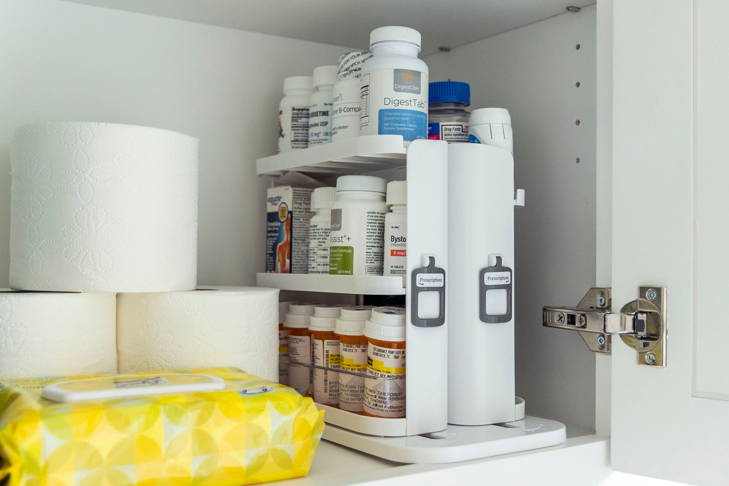 Cabinet Caddy SNAP!™ is a modular, instant-access, pull-and-rotate organizer that makes the most of vertical space. Maximize tidiness in tight spaces and find what you want, when you need it. The adjustable shelves fit different-sized containers including spices, medicines, cosmetics, craft supplies, and so much more.