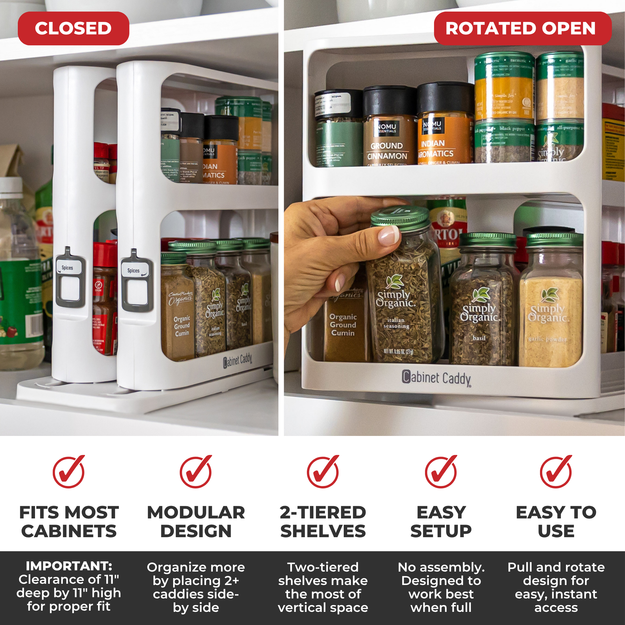 An instant-access, pull-out cabinet organizer makes the most of vertical space to maximize tidiness. Its pull-and-rotate design helps you stay organized in kitchen cabinets or cupboards. Double-decker shelves fit different-sized containers, including spices, medicine, cosmetics, and craft supplies, and keep it all neat and orderly.
