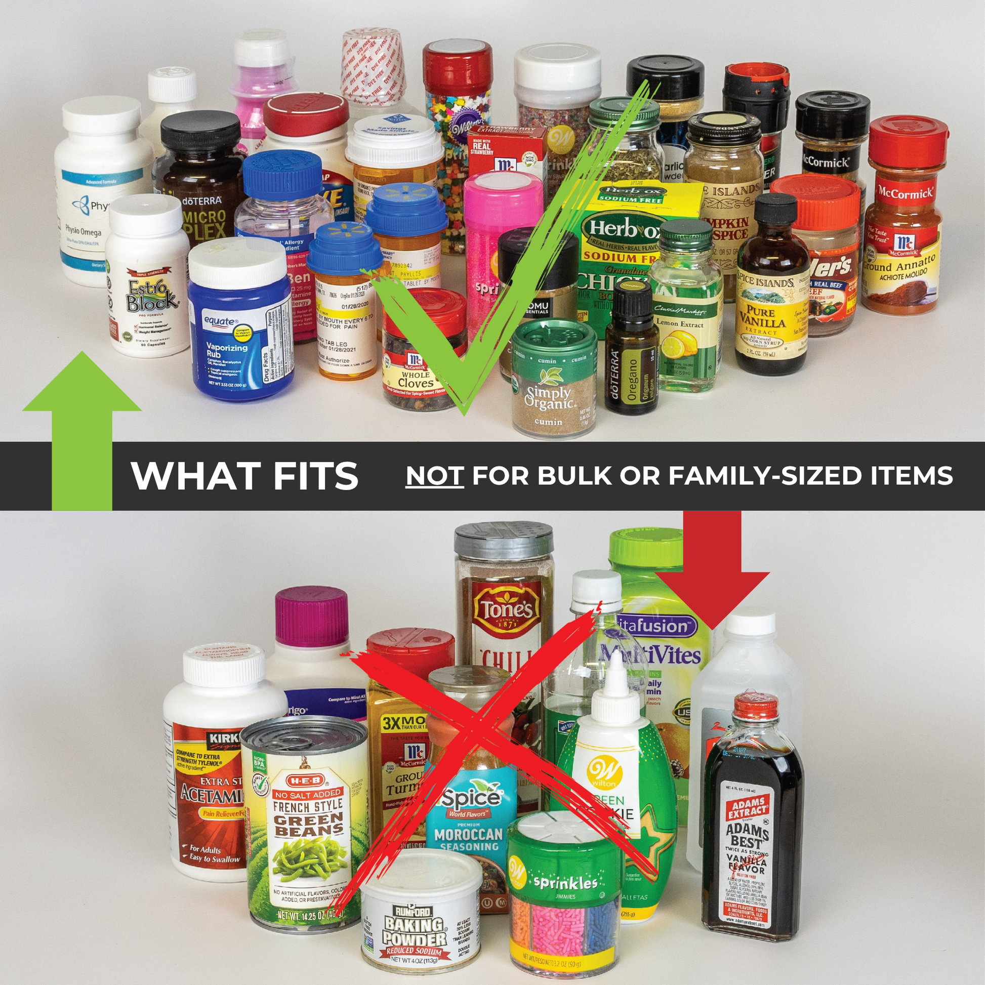 The Cabinet Caddy includes Foam Stability Inserts yo keep smaller from tipping when shelves are not full, as well as peel & stick labels for the handles to keep even more organized.