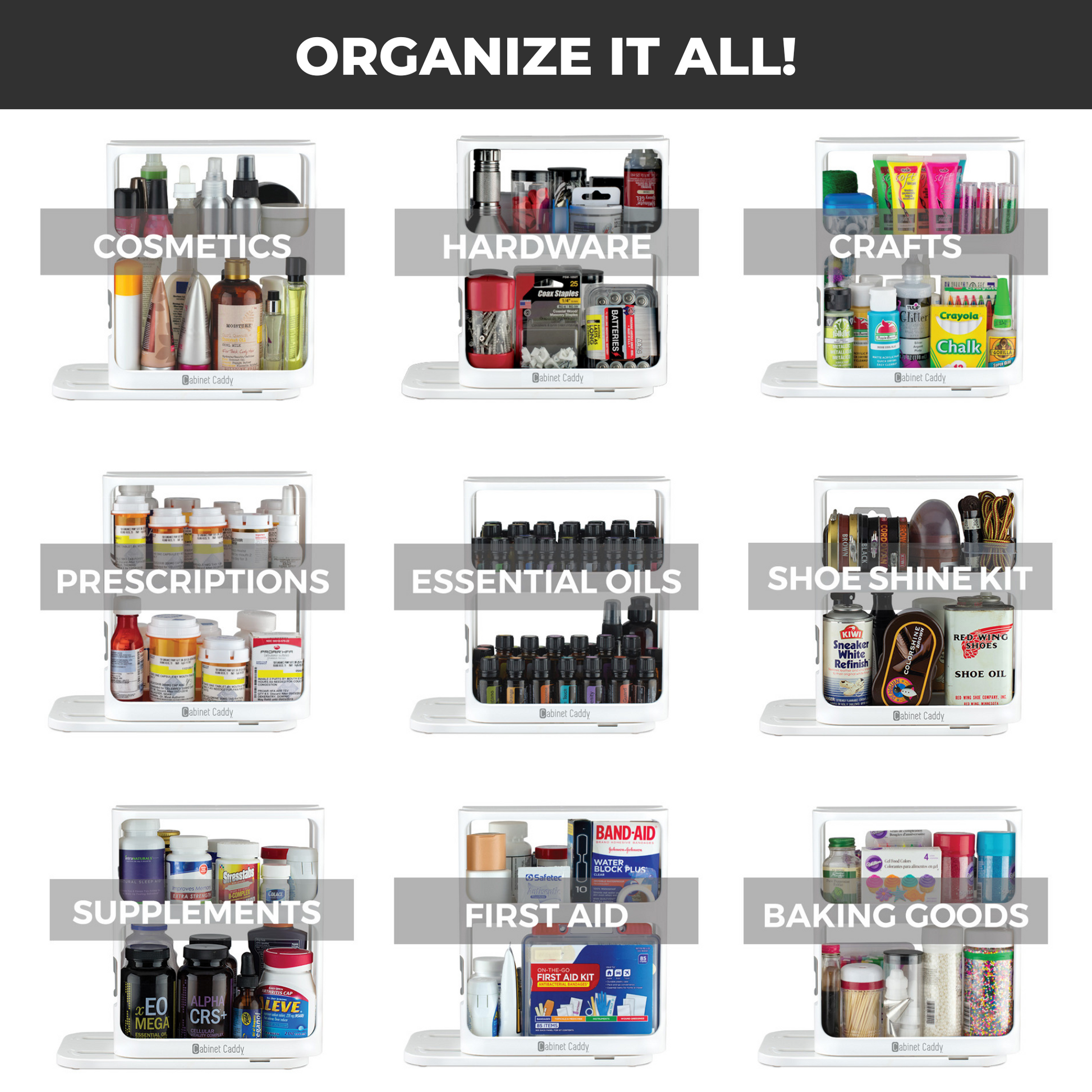 The Cabinet Caddy can help you organize any of those small items around your house that need to be kept together, but without simply throwing them into a hard to dig through bin!