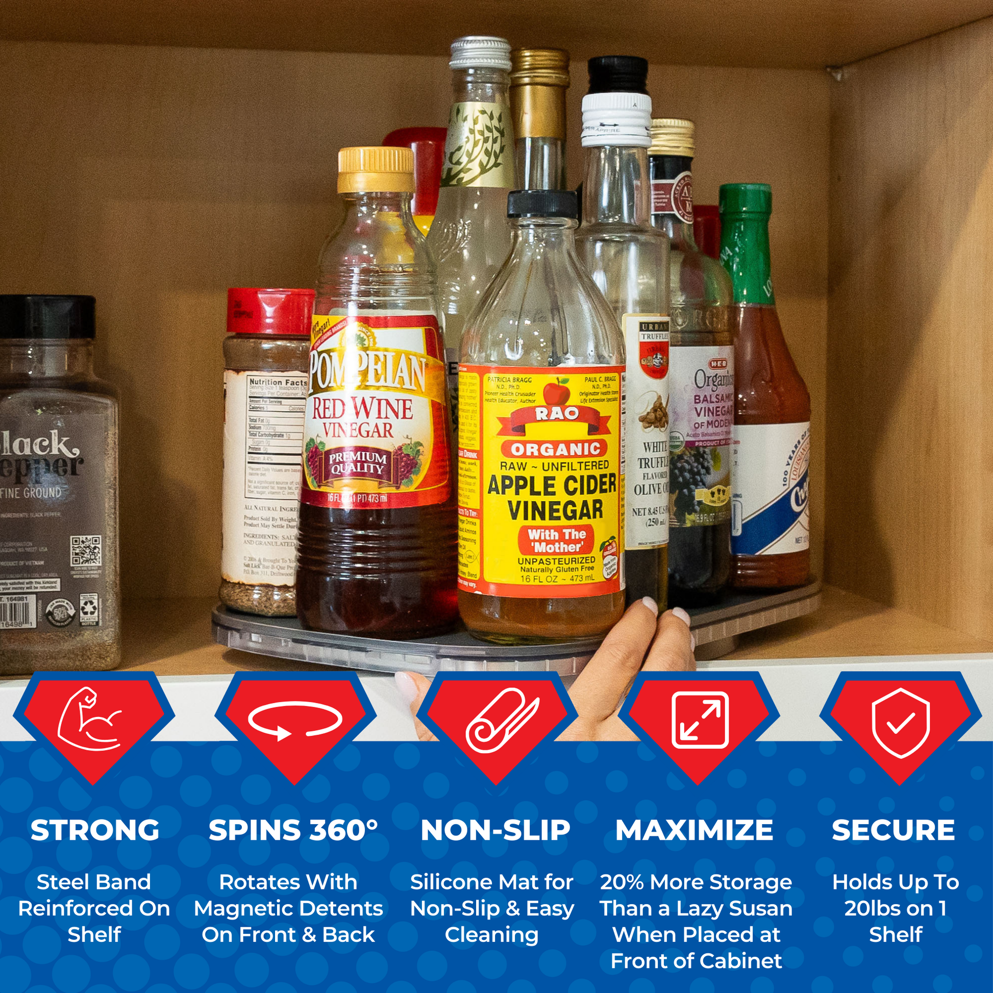 The Mighty Susan Sidekick knocks out the competition with her steel band-reinforced shelf, holding up to 20lbs of your tall ingredient bottles or other items. And the smooth 360° rotation allows you to effortlessly find what you need, when you need it.