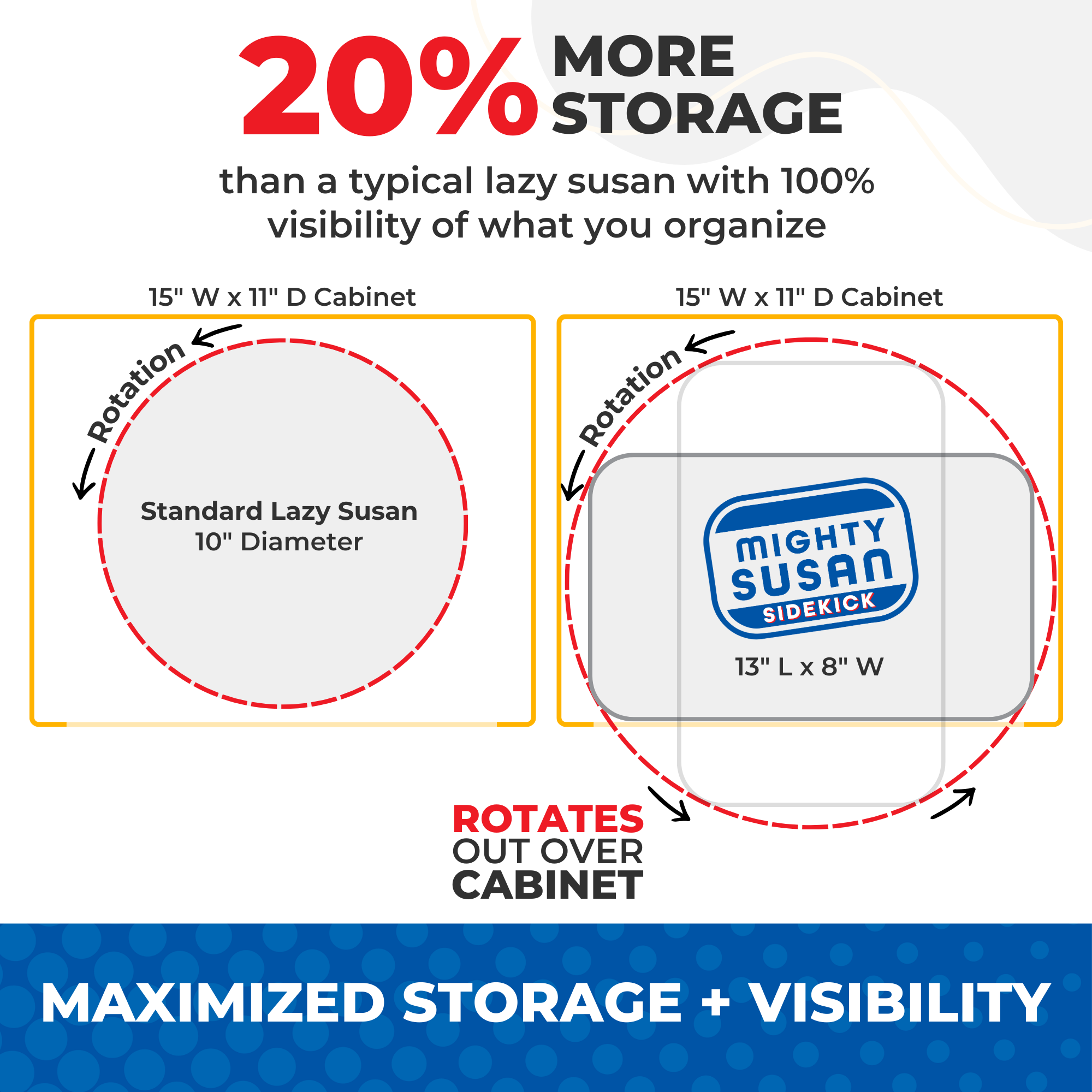 - Rectangular design sits front and center, swinging out over the edge as it spins. Maximizes storage by up to 20% compared to the typical, round Lazy Susan. Required cabinet depth of 11” for proper fit.