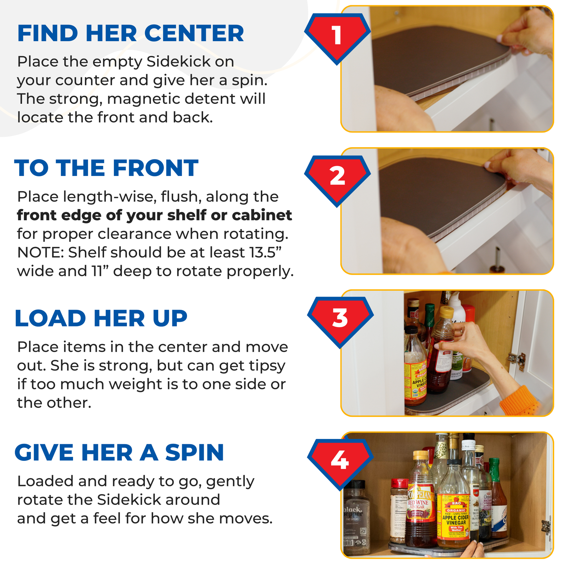 The Sidekick is the all-new ally to our popular Mighty Susan organizer. Built with the same steel-reinforced, rotating design, the Sidekick can hold all of your taller cabinet or pantry items for easy access. The rectangular design sits flush at the front of your cabinet or pantry shelf, allowing it to rotate outside of the cabinet. This gives you up to 20% more storage than other methods.